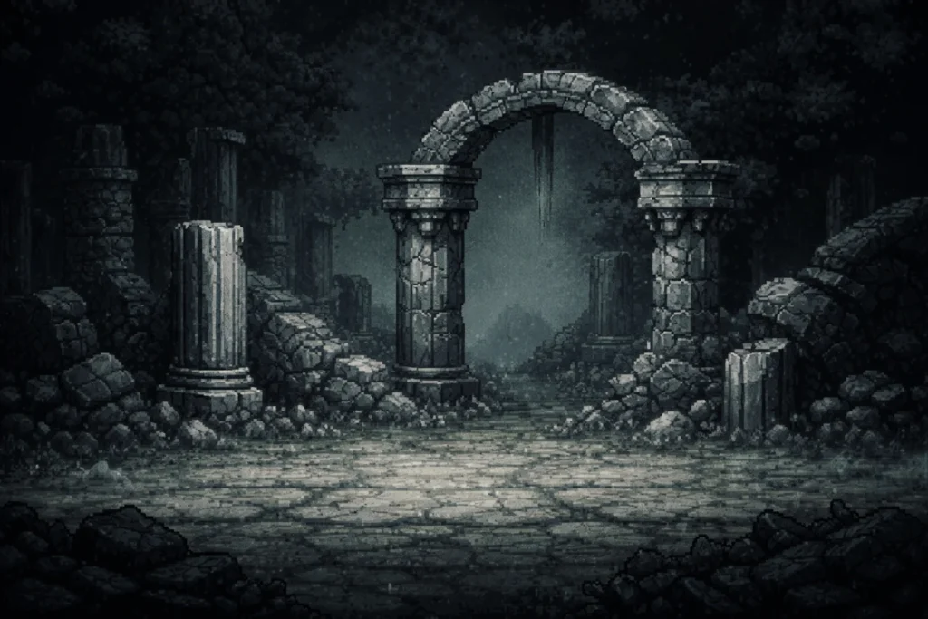 • Arcos rotos, columnas partidas, escombros al fondo.