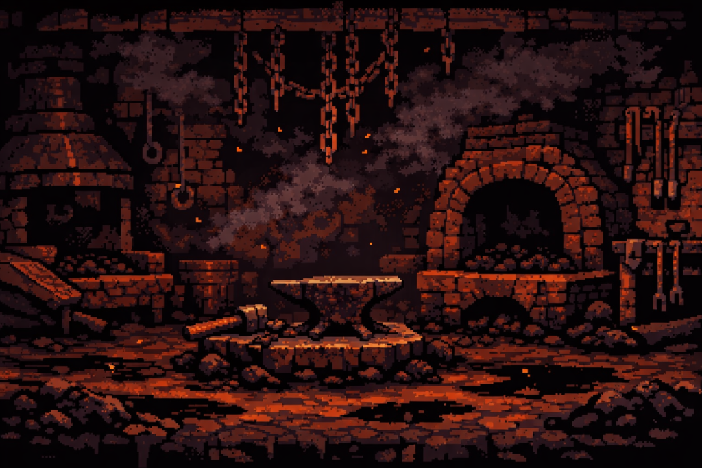 • Yunque, cadenas colgantes, herramientas, hornos apagados.