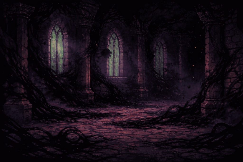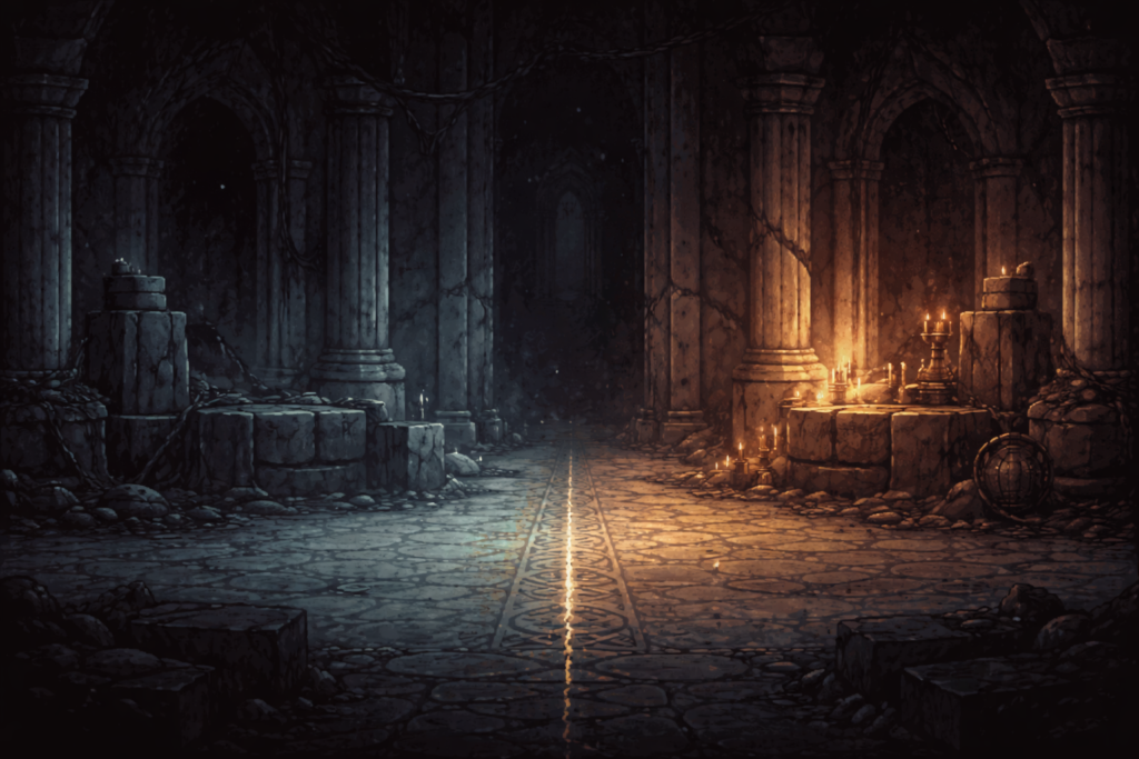 Concepto: un pasillo/umbral donde las sombras parecen moverse solas.